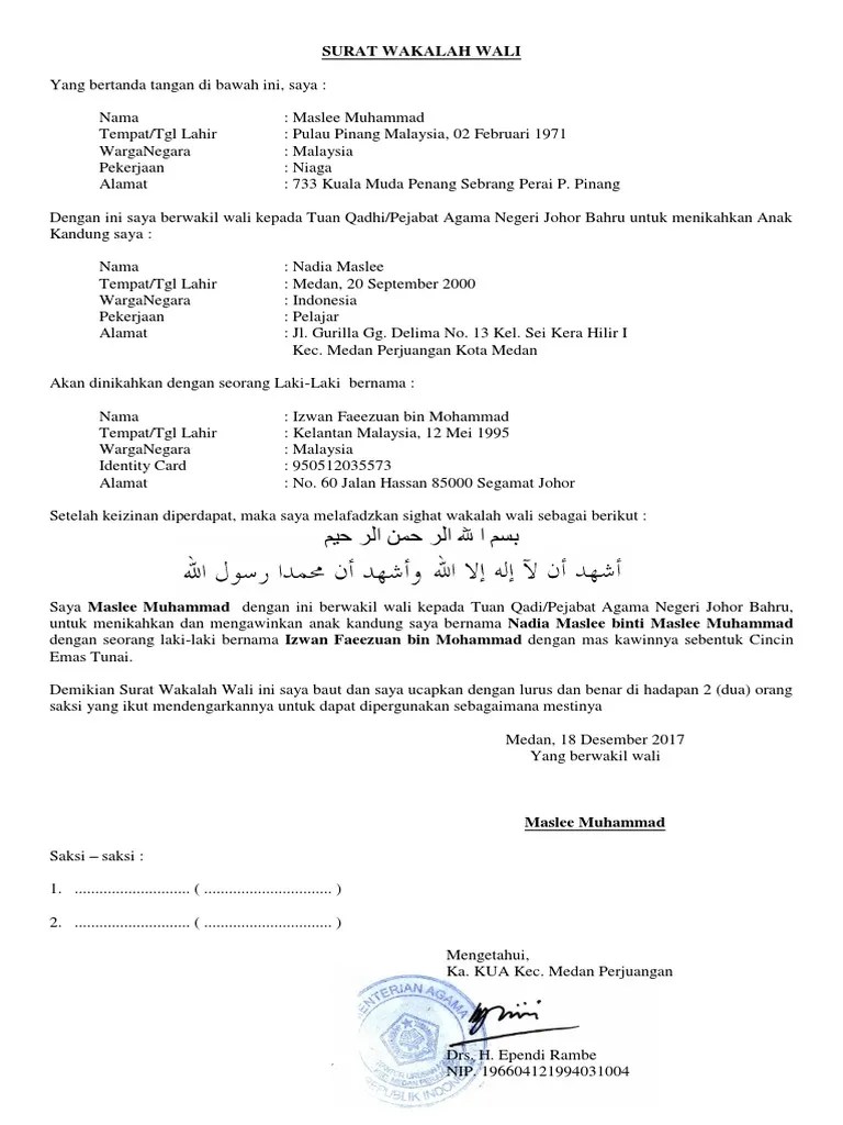 Untuk muslim perempuan wajib melampirkan surat wali yang di legalisir dan. Contoh surat wali dan pengesahan kematian ibubapa : Sijil kematian bapa atau datuk / sijil kematian wali jika bukan wali . Fotocopy kk dan ktp yang meninggal; Dengan hormat , yang bertandatangan dibawah ini.